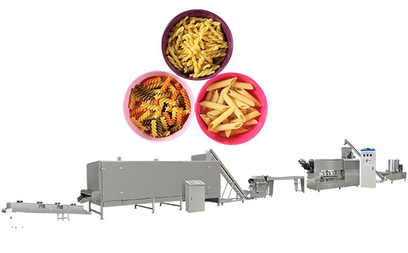 Смешивание сырья (смеситель) → экструзия и формование (экструдер макаронных изделий) → сушка (сушилка) → охлаждение (охлаждающая машина) → упаковка (упаковочная машина) (опционально)